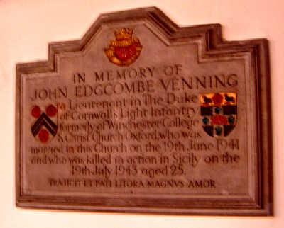 MEMORY OF JOHN EDGCOMBE VENNING A LIEUTENANT IN THE DUKE OF