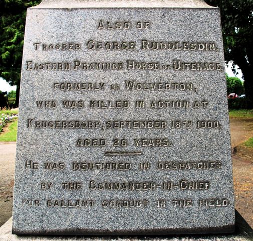 Trooper, Eastern Province Horse of Utenage. Killed in action at Krugersdorp 8th September 1900. Aged 26. Formerly of Wolverton. Mention in Desptaches. |