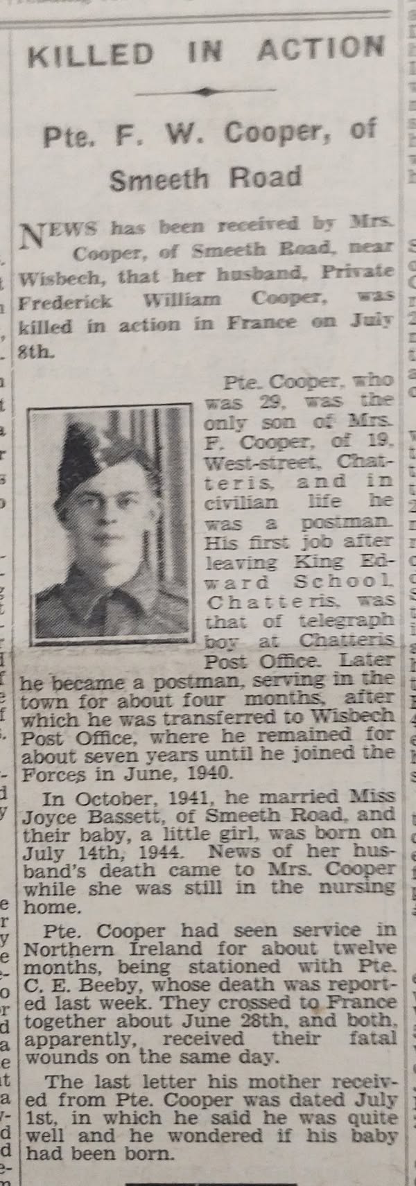 Eric   | Private 5783546, 7th Royal Norfolk Regiment. Died of wounds 9-7-44, age 21. Son of Sidney & Daisy Elizabeth Beeby, of 22 Burnsfield Estate, Chatteris. Cambes-En-Plaine War Cemetery, Calvados, France. | ||