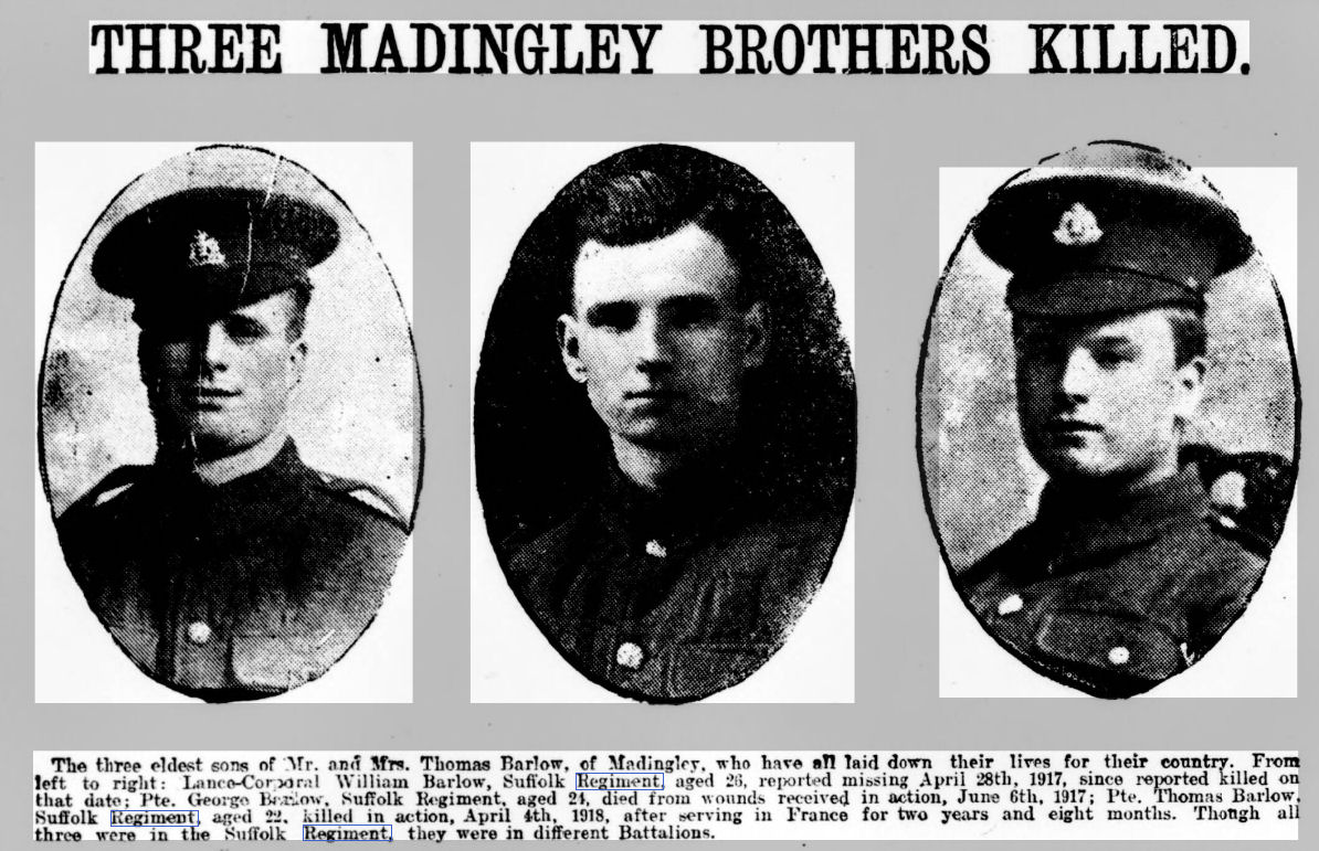 on 28th April 1917. Son of Charles and Emma Barlow, of Madingley,