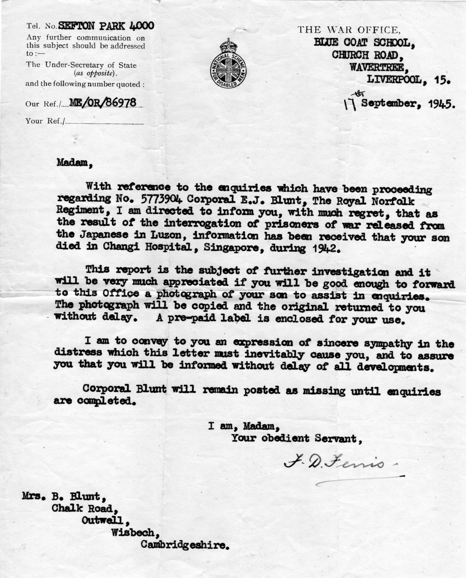 Charlotte of Wales) formerly 4769 Cambridgeshire Regiment. Killed