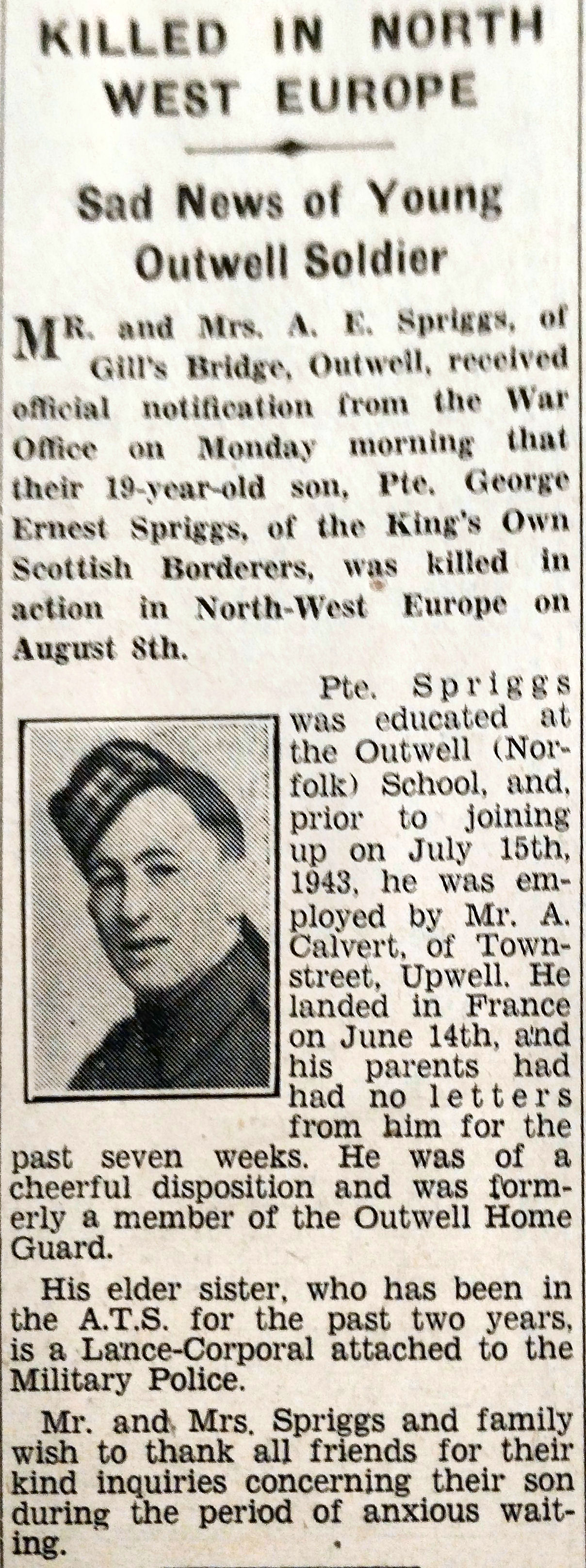 Born and resident Outwell, Cambridgeshire, enlisted Norwich. Son