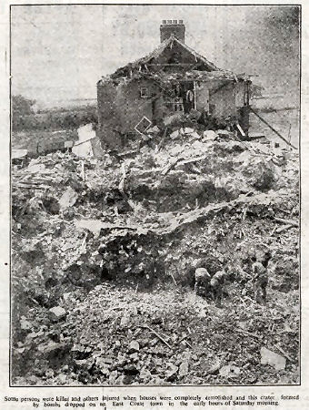 Mr. Roberts is 68, and a Special Constable. His wife is 72. He had come off reserve duty and heard a 'plane overhead. "That sounds like a German." he said to his wife. He still had his uniform on, and putting on his steel helmet, he went to the front door. Then came terrific crash. Although stunned he called to his wife to “take cover.” More crashes followed. Mr. Roberts called to his wife, as debris flew in all directions, "For heaven's sake keep against the chimney."