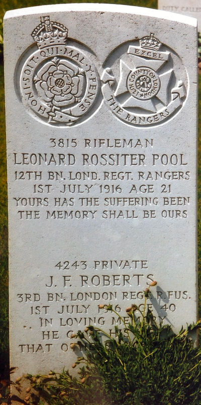 Private G/9263, 6th Battalion, Queen's (Royal West Surrey Regiment). Died of wounds 9th October 1916. Born Redman (sic), Herts, enlisted and resident St. Albans. Buried in DARTMOOR CEMETERY, BECORDEL-BECOURT, Somme, France. Plot II. Row D. Grave 35.