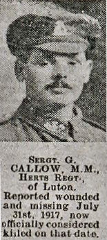 Corporal 265202, 1st Battalion, Hertfordshire Regiment. Killed in action 31st July 1917. Aged 24. Born New Southgate, Middlesex, enlisted and resident St. Albans. Son of Robert W. and Sarah Rose Waters, of 21, Westbourne Terrace, St. Albans. Awarded the Military Medal (M.M.). Burie din NEW IRISH FARM CEMETERY, West-Vlaanderen, Belgium. Plot XX. Row A. Grave 20. See also High Street memorial.
