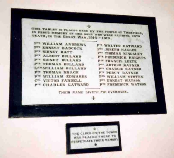 TABLET IS PLACED HERE BY THE PEOPLE OF THERFIELD, IN PROUD MEMORY OF HER SONS WHO WERE FAITHFUL UNTO