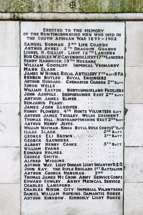 | GOODLIFE | William | [Spelt GOODLIFFE and GOODLIFF elsewhere] Private 4972, 38th (Buckinghamshire) Company, 10th Battalion, Imperial Yeomanry. died of enteric 26th January 1901 at Kimberley. Aged 31. Church of England. Buried in West End Cemetery, Kimberley. Commemorated on a brass plaque in Huntingdon All Saints church. Also commemorated on Coombe Hill, Wendover, Buckinghamshire and Peterborough Cathedral Memorials. Listed in Peterborough & Huntingdon Standard 1st March 1900 | Huntingdon |