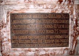 Lieutenant, Royal Engineers, Died 11 February 1900 at De Har, South Africa. Aged 25. Son of Reverend William M.A., vicar of Cranbrook and Honourary Canon of Canterbury Cathedral. Bell.- Lieut. Reginald William Bell, Royal Engineers, died of enteric Feb. 11th, 1900, at De Aar. He was the eldest son of Rev. W. Bell, vicar of Cranbrook, late Headmaster of Dover College. Lieut. Bell was born in April, 1874, and educated at Dover College, where he was captain of the Football XV. At the Royal Military Academy, Woolwich, he played for the Academy, and also for the R.E. at Chatham. He was a keen sportsman and a good horseman. He entered the Royal Engineers, July, 1893, being promoted lieut. 1896. He was stationed at Gibraltar in 1899, and went from there to South Africa in Nov., and served in Cape Colony. Source: "The Last Post - Roll of Officers who fell in South Africa 1899-1902" by Mildred G Dooner.
