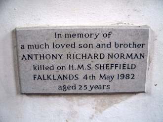 | NORMAN | Anthony Richard | Petty Officer Weapons Engineering Mechanic (POWEM(R)) D126569P, H.M.S. Sheffield, Royal Navy. when his ship was hit by an Exocet missile 4 May 1982. Aged 25. Born 22 November 1956. Resident Gosport, Hampshire. Extract from England & Wales Government Probate Death Index 1982: