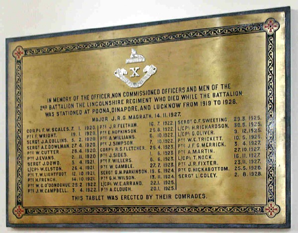 The church contains the chapel of the Royal Lincolnshire Regiment within which, on an engraved brass plaque, which was formerly in the garrison church at Lucknow on which are the names of the officer, non-commissioned officers and men of the 2nd. Battalion the Lincolnshire Regiment who died while the battalion was stationed at Poona, Dinapore, and Lucknow from 1919 to 1928.
