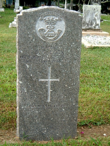 [Listed on grave as D G LOCK] Captain 113776, 1st Battalion, Somerset Light Infantry attached King's Own Yorkshire Light Infantry. Killed while bathing near Bidor, Perak 2 October 1948 during the Mayan Emergency. Aged 31. Killed while bathing near Bidor, Perak. Buried in Batu Gajah Christian Cemetery, Ipoh, Perak. Grave 934.