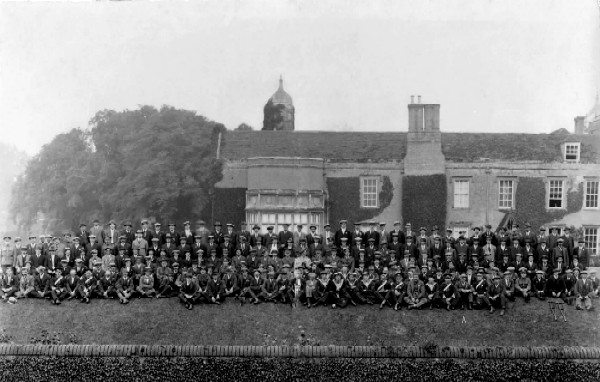 This photograph is of the reunion of the Long Melford fighting renunion circa 1919-1920. The picture was taken at the rear of Melford Hall (the red brick tudor building on the green) you can just see the tops of the towers behind the roof. The small arrow pointing upis James Nunn who joined the Army Service Corps on 6th November 1916 at Park Royal, London, Company 662. Reserve Depot, based at Park Royal, London. Army No. T/4/276135. Rank Driver. The ASC Horse Transport Company. The only other person possibly identified is the gentleman in the centre of the photo in the light coloured uniform who is believed to have been Rev. Sir William Hyde Parker of Meford Hall. Can you identify any of the others, if you can then email us using this link.