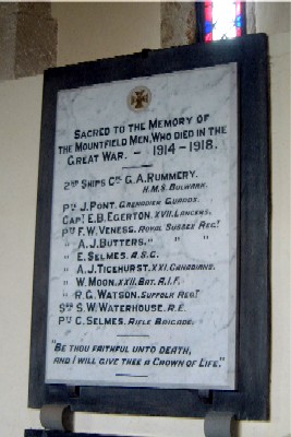 Ships Corporal 2nd Class 208425, H.M.S. Bulwark, Royal Navy. Died 26th November 1914. Age 31. Son of William and Sarah Rummery, of Woodsdale Cottage, Battle Rd., Mountfield. Buried in ALL SAINTS CHURCHYARD, MOUNTFIELD, Sussex. |