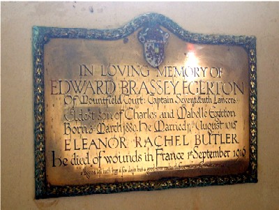 Captain, "D" Squadron, 17th (Duke of Cambridge's Own) Lancers. Died of wounds 6th November 1918. Age 27. Born 3rd March 1880. Son of C. A. Egerton, and Lady Mabelle Egerton, C.B.E., of Mountfield Court, Robertsbridge; husband of Lady Eleanor Rachel Egerton, daughter of 4th Marquess of Ormonde, married 17th March 1915; brother of Charles Ralph Egerton (killed in World War 2, see below). Buried in HABARCQ COMMUNAL CEMETERY EXTENSION, Pas de Calais, France. Plot VIII Row E Grave 3.
