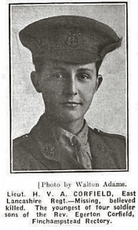 Second Lieutenant 153rd Brigade Royal Field Artillery-died 17th June 1917 aged 29. Son of Reverend Egerton Corfield M.A. Rector of Finchampstead, Berkshire and Ethel Grace Corfield-Buried in in Hazebrouck Communal Cemetery grave no: I.G.25 |