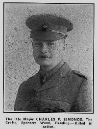aged 38, son of Mr and Mrs Simonds of Redlands, Reading, husband