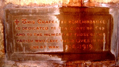 In the parish church can be found a chapel dedicated to those who fell. In the chapel is glass topped case containing a book of remembrance with details of the men who fell in World War 2.