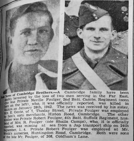 Killed on Active Service.—Mrs. W. Foulger, of 208, Coldham's Lane, received news from the War Office that her husband, Pte. W. J. Foulger, No. 4806723, Lincolnshire Regiment, attached R.A.O.C. Middle East Forces, has been reported killed on active service on February 23rd. He was an old boy of St. George's School. A native of Cambridge, he was 28 years of age, and had been four years in the Army.