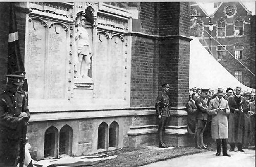 This tablet was placed on the external wall of the Chapel under the east window. Under the statue of St. George was the inscription: "To the immortal memory of Old Leysians who fell in the 1914-1919," while along the bottom of the Tablet, under the name panels, appeared the following words : "My marks and scars I carry with me to be a witness for me that I have fought His battles, Who now will be my rewarder."