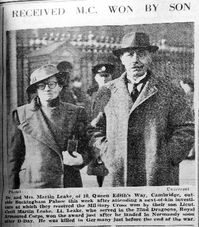 Cecil William Rhodes Martin-Leake won the Military Cross for his actions in Normandy in 1944. He was killed in action the following year. On 1st November 1946, his parents collected that award from Buckingham palace. This article is from the Cambridge Daily News in 1946.
