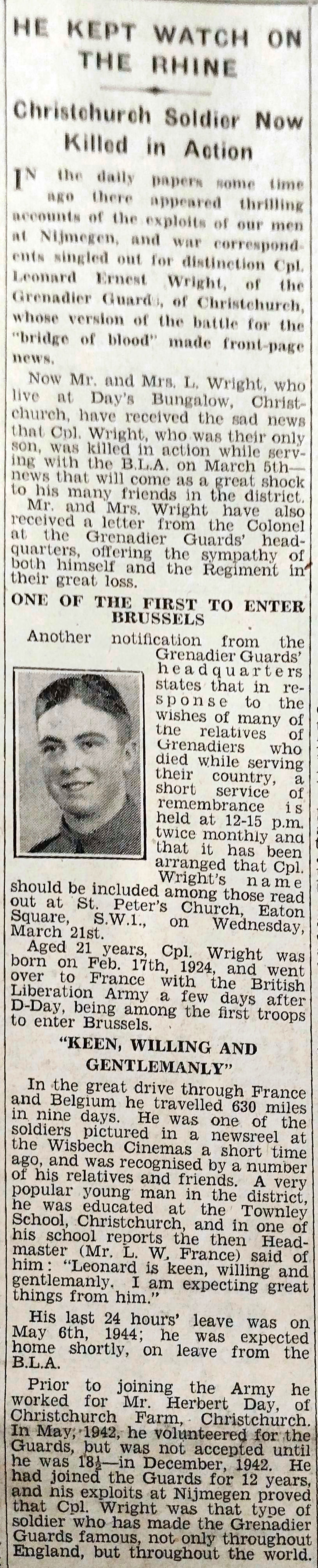 L/Cpl 2623732, 1st Grenadier Guards. 5-3-45, age 21. Son of Leonard & Elizabeth Hardy Wright, of Day's Bungalow, Christchurch. Reichswald Forest War Cemetery, Germany. See also Upwell.