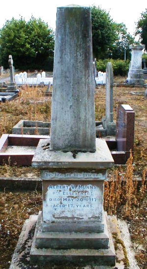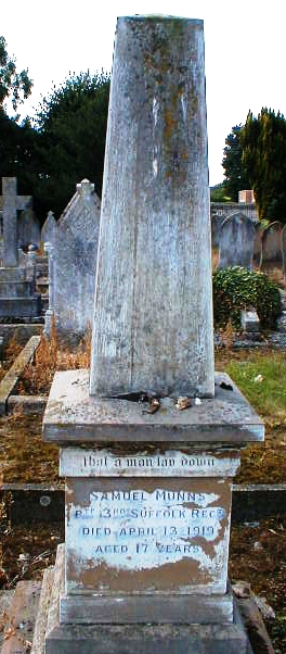No record of military service currently found. In the 1891 census he is aged 7, a scholar, born Fordham, residnet with his parents, Walter and Eliza Munns, at Manns Yard, Fordham, Newmarket, Cambridgeshire. In the 1901 census he was aged 17, bricklayers labourer, unmarried, born Fordham, resident with his parents Walter and Eliza Munns, at Fysons Yard, Church Street, Village, Fordham, Newmarket, Cambridgeshire. |