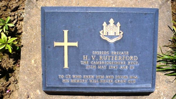 Private 5933505 1st Battalion The Cambridgeshire Regiment, Suffolk Regiment, prisoner of war, who died on Sunday, 27th May 1945. Age 25. Son of Ernest Rutterford and Rosanna Rutterford, of Haslingfield, Cambridgeshire. Buried in KANCHANABURI WAR CEMETERY, Thailand. Grave Plot 6. Row E. Grave 4.