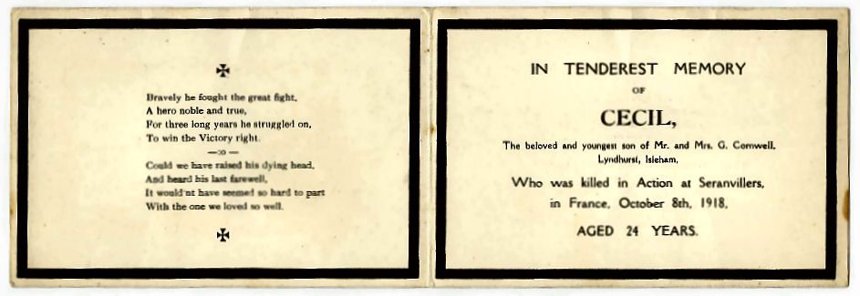 wounds 30 October 1918. Aged 20. Son of George and Ada Jane Cornwell,
