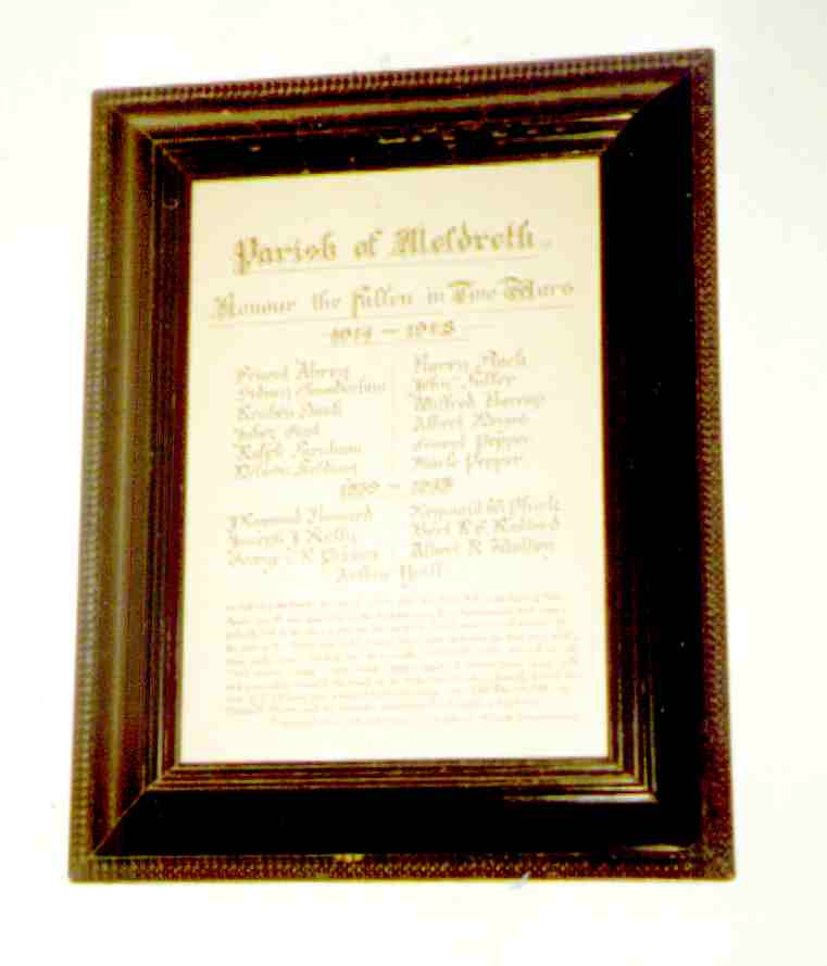 On Saturday the twenty-first day of October 1950 the treble bell in the tower of this parish church was dedicated by the archdeacon of Ely, the venerable H.F. Kirkpatrick, M.A., To the glory of God, for the use of his church, and in proud memory of the men of the parish who in two world wars gave their lives for their King and their fellow men. The bell bears the inscription: "Honour . The . Fallen. In Two . Wars . 1914-1918 . And . 1939-1945"; it weighs 4 cwt. 2 grs. 271bs: and was cast by Mears & Stainbank at the Whitechapel foundry. Towards its cost the sum of £125 came from a bequest by the late George S. W. JEBB, esquire, M.A., of Meldreth Manor, and the remainder was subscribed by the people of this parish. F. Conquest GLARE, M.A., F.S.A., Vicar; G.M. ADCOCK, A. TUCK, Churchwardens. |