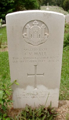 Lance Corporal , 5933730, 2nd Cambridgeshire Rgt, Suffolk Regiment. 3-9-44, age 25, Prisoner of War. Son of Mr & Mrs A J Hall, of Parson Drove. Sai Wan War Cemetery, Hong Kong.