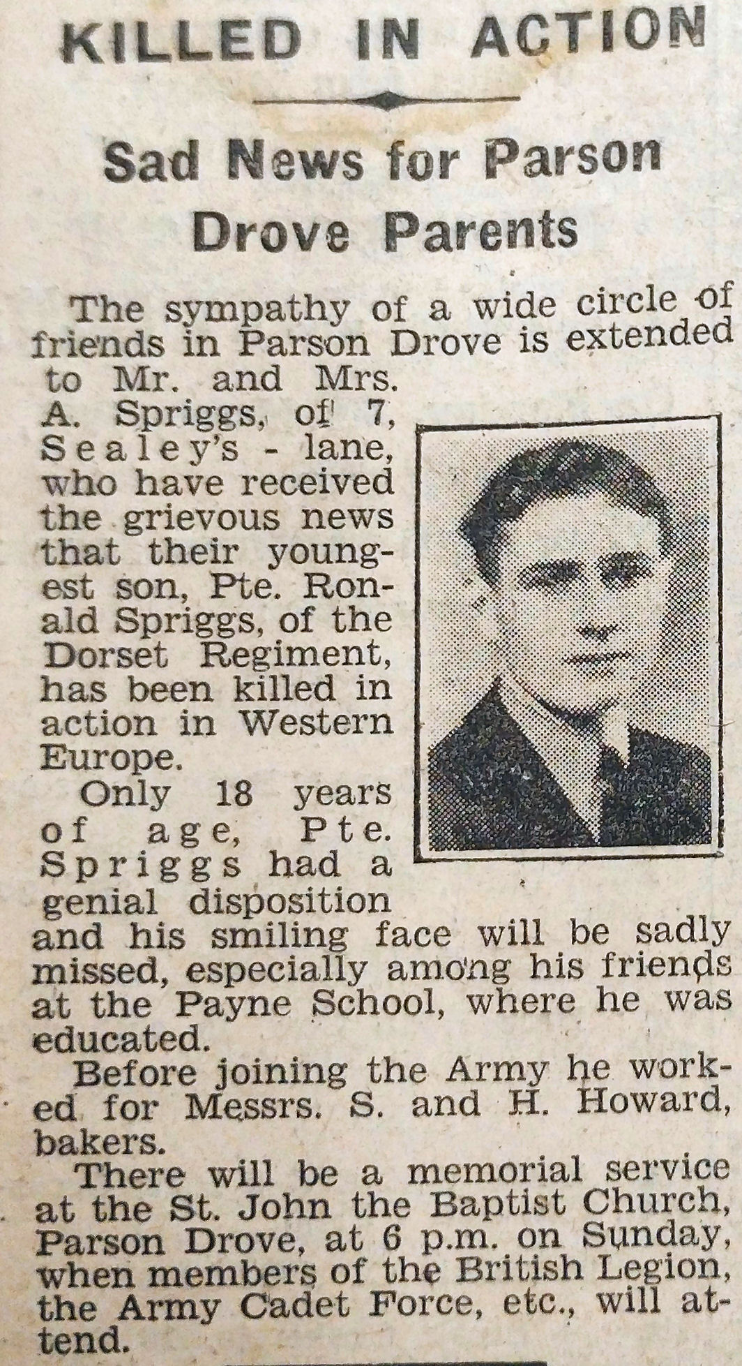 Pte. Crowson was a popular lad in the village, attending in his early days the Payne School; prior to joining up at the outbreak of war he was employed by the late Mr. A. S. Coates as an agricultural worker at Sutton St. Edmund.