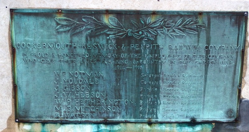 Keswick & Penrith Railway Company. In proud & honoured memory of the employees of this company who gave their lives for King & Country in the Great War 1914 – 1918. |
