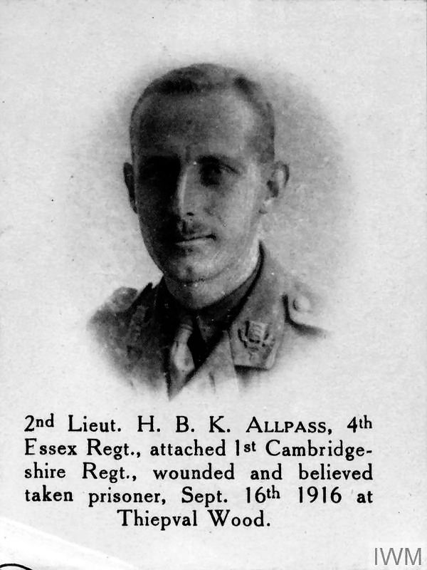 Extract from Chelmsford Chronicle - Friday 15 June 1917, page 5, Yorkshire Post and Leeds Intelligencer - Friday 15 June 1917, page 3, and Essex Newsman - Saturday 16 June 1917, page 2: Sec.-Lt. Henry Blythe King Allpass, Essex Regt., reported missing since Sept. 16 last, now presumed killed, was the eldest son of the Rev. H. A. Allpass and Mrs. Allpass, of Chingford. He was born in 1893 and was an old Chigwellian. He entered the teaching profession and was appointed senior modern language master at St. Bees School. His second brother, Lt. E. T. Allpass, was killed in Gallipoli. Extract from England & Wales Government Probate Death Index 1917: ALLPASS