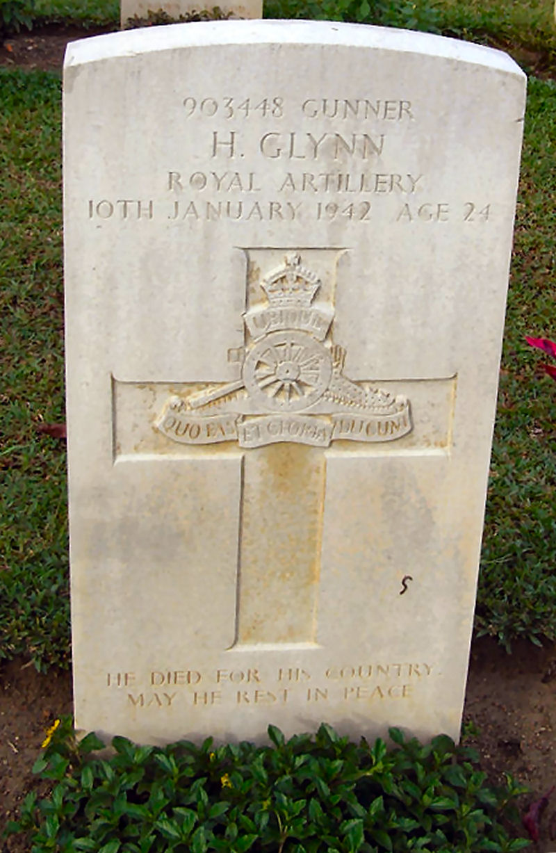 Gunner 903448, 137 Field Regiment, Royal Artillery. Died 10 January 1942. Aged 24. Son of Albert Glynn, and of Alice May Glynn, of Blackpool, Lancashire. Buried in TAIPING WAR CEMETERY, Malaysia. Plot 1. Row H. Grave 6.