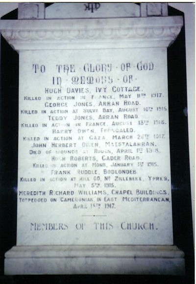 (Chapel Buildings) Private TF/291911, 7th Battalion, The Royal Welsh Fusiliers. 53rd Welsh Division. Drowned in SS ‘Cameronia’ 15th April 1917. Torpedoed East of Malta. Also on the Parish Church Memorial. Born and enlisted in Dolgelley. No known grave. Commemorated on Chatby Memorial, Alexandria, Egypt. |