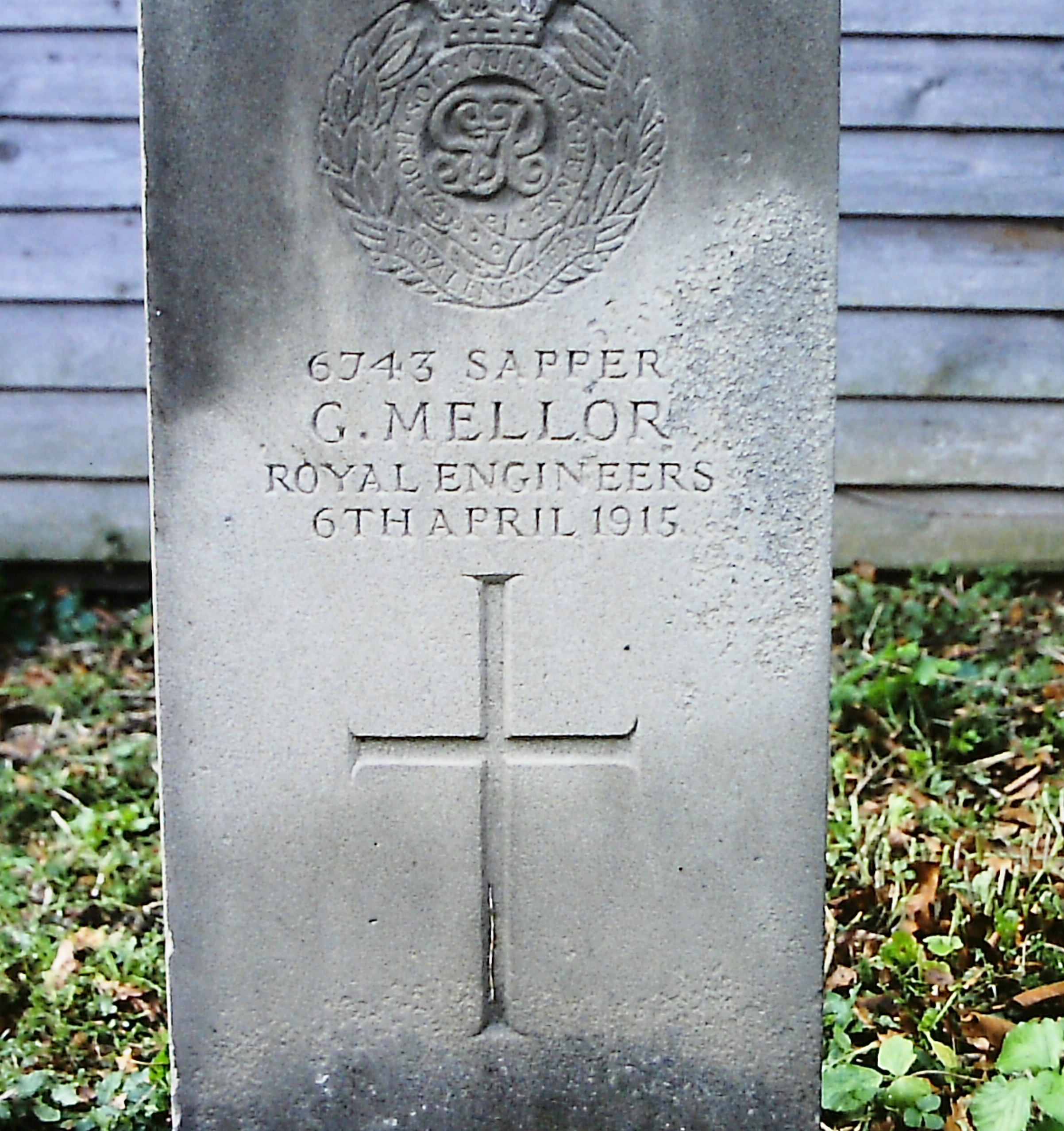 Sapper 6743, 59th Field Company, Royal Engineers. Died 6 April 1915. Born Matlock, Derbyshire, enlisted Sheffield, resident Crick, Derbyshire. Son of the late G. and S. A. Mellor. Buried North-West of Church in Cley-Next-The-Sea (St. Margaret) Churchyard.
