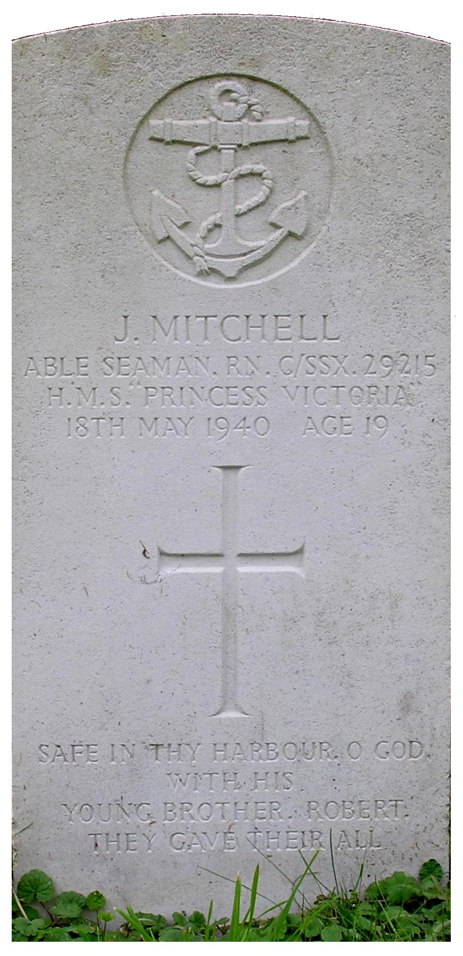 Able Seaman C/SSX 29215, H.M.S. Princess Victoria, Royal Naval Volunteer Reserve.  Killed when his ship, a minelayer, sank after striking a mine at the mouth of the River Humber, 18 May 1940. Aged 19. Son of Robert Wright Mitchell, and of Sarah Mitchell, of Shaw, Lancashire. His brother Robert also died on service. Buried Cley-Next-The-Sea (St. Margaret) Churchyard.