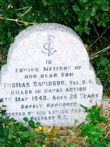 Telegraphist P/UD/X 1397, H.M.S. Princess Victoria, Royal Naval Volunteer Reserve.  Killed at sea when his ship, a minelayer, sank after striking a mine at the mouth of the River Humber, 18 May 1940. Aged 20. Born 17 November 1919 in Belfast, Co. Antrim, Northern Ireland. Son of Elizabeth Davidson; husband of M. Davidson.  Buried Cley-Next-The-Sea (St. Margaret) Churchyard.