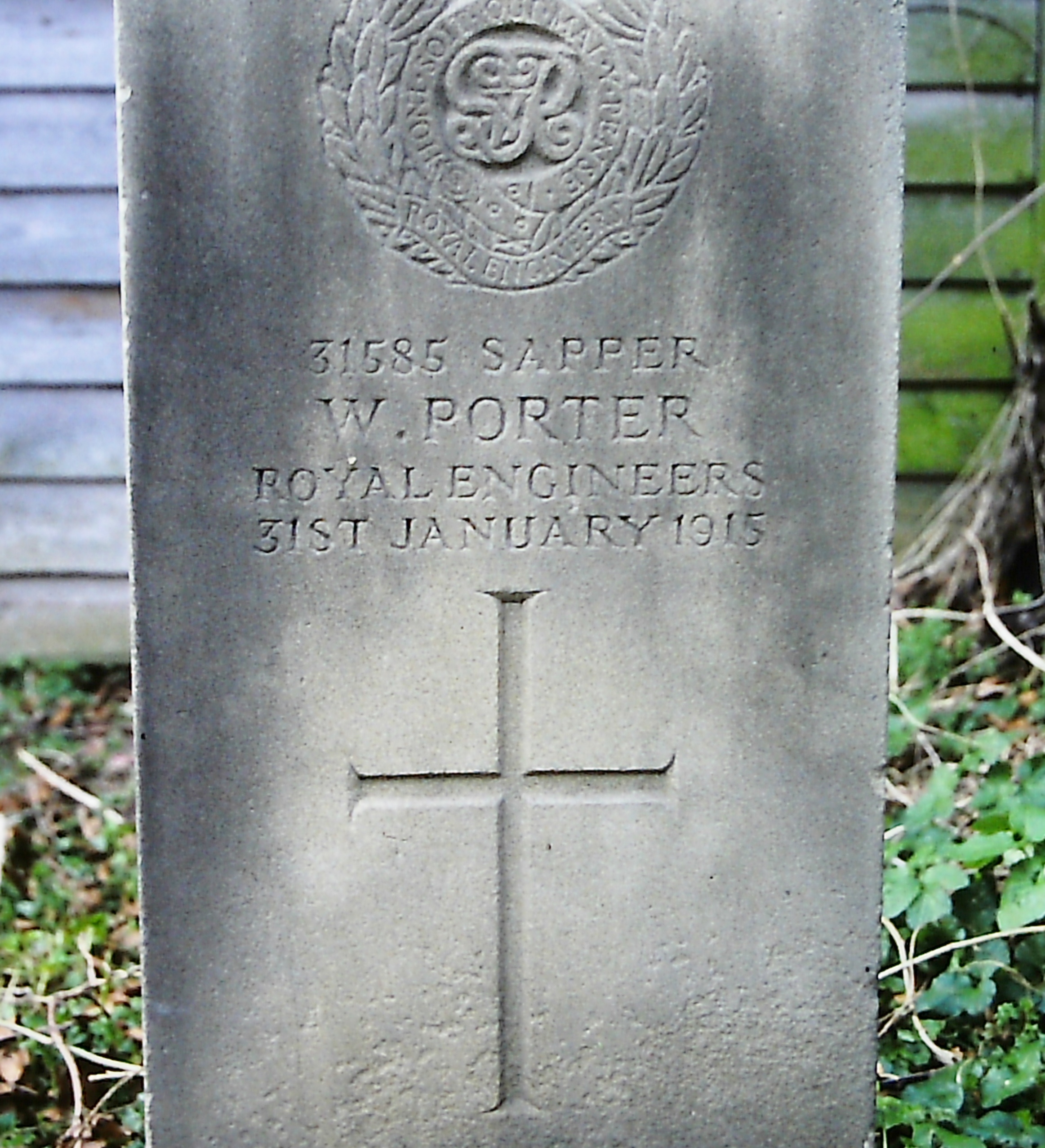 Information Richard Jefferson took from the Norwich Mercury of 13th February 1915 told him that Sapper William Porter (31585 RE) died on 31st January of consumption (tuberculosis) in the Zetland Sanitorium, Cley. He had been sent there from his home in Blackheath, Kent. He was aged 44 and a veteran of the Boer War in South Africa (1899-1902). He left a widow and six children. He was accorded a full military funeral in St Margaret's Church on 4th February, with soldiers from the South Notts Hussars and Royal Sussex Regiment present. These two regiments were training locally.