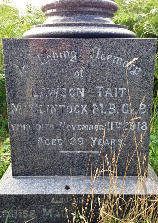 Captain.  RAMC. Not on CD or CWGC.  (Thanks to David Crease for this information). Dr. McClintock was Medical Officer of Health for the Rural District Council.  When war broke out he organised the Red Cross Hospital in the town to look after wounded and convalescent soldiers.  Mrs.  Loddon ran the hospital.  The hospital caught fire on the night of 2nd October 1918 and Dr. McClintock, who was suffering from flu at the time,  got up from his sick bed to relocate the patients.  As a result of this he developed  complications, and died on 11th November 1918.  He was 39 years old. He is buried in Heckingham churchyard.