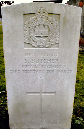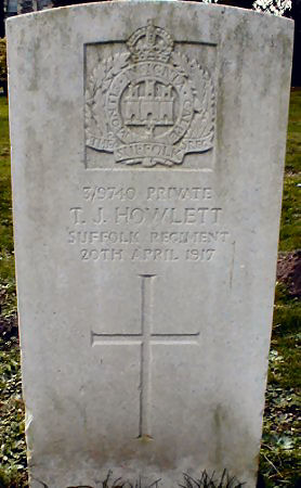 Private 24880, 11th Battalion, Suffolk Regiment. Killed in action 3 April 1917, buried ST. NICOLAS BRITISH CEMETERY, Pas de Calais, France. Born Little Wilbraham, enlisted Newmarket. |
