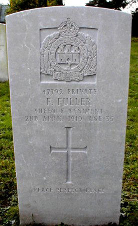 Corporal 320923, 15th Battalion, Suffolk Regiment. Died of wounds 5 November 1917 [SDGW states 6 November 1917]. Aged 39. Buried in BEERSHEBA WAR CEMETERY Israel. Husband of Alice M. Fuller, of 6, Field Terrace Road, Newmarket, Suffolk. Served in the Boer War. Brother of Frederick below. Born Chippenham, enlisted Newmarket. Formerly 3/9551, Suffolk Regiment. |