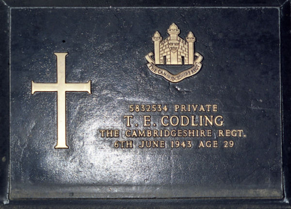 Private 240830, 1st/5th Battalion, Suffolk Regiment. 7th July 1919. Aged 22. Son of Edward Walter and Beatrice Elizabeth Codling, of "The Laurels," St. Catherines Rd., Long Melford. Born at Long Melford. Buried in HOLY TRINITY CHURCHYARD, LONG MELFORD, Suffolk.