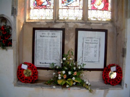 The memorial stands at the entrace to Holy Trinity Church high on the hill overlooking Long Melford it contains the surnames and intials of those who died in World War 1 and 2. In addition to the memorial there are two handwritten scrolls within the church containing the names of those who died in World War 1 and World War 2; these contain full names, rank and Regimental details; one man does not appear on the Roll of Honour for World War 1 that is on the memorial. Additionally the church contains plaques covering several centuries of history. There is also a photograph of a reunion of Long Melford's fighting men taken circa 1919-1920.