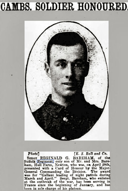 Son of George and Emily Bareham, of Newton, Cambs.; husband of Florence